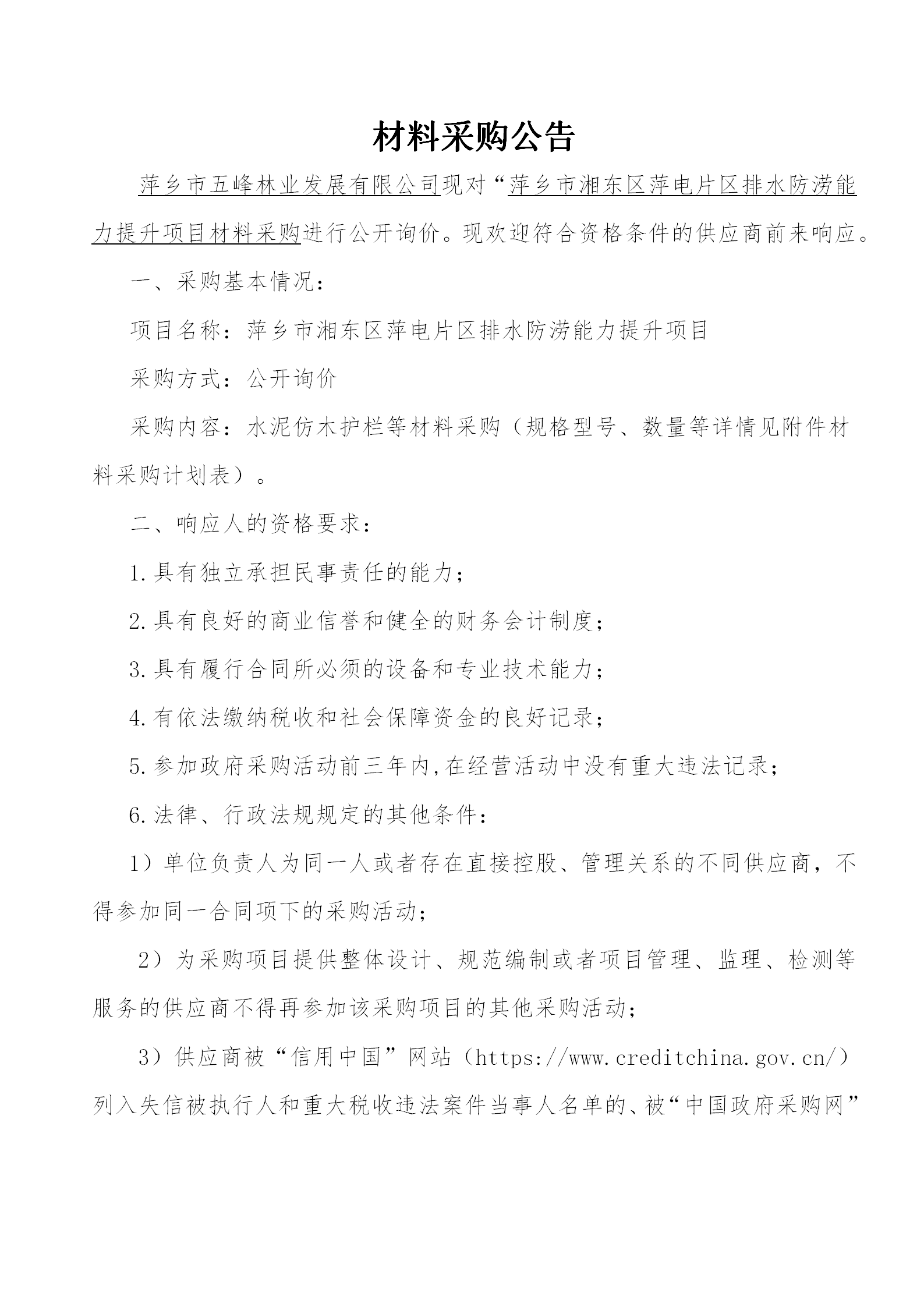 萍鄉(xiāng)市五峰林業(yè)發(fā)展有限公司現(xiàn)對“萍鄉(xiāng)市湘東區(qū)新棚里小區(qū)老舊小區(qū)改造項(xiàng)目材料采購進(jìn)行公開詢價(jià)?,F(xiàn)歡迎符合資格條件的供應(yīng)商前來響應(yīng)。