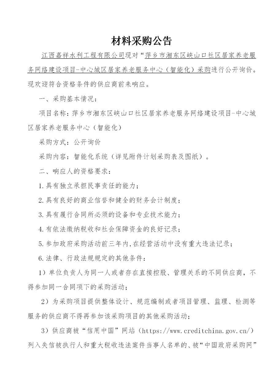 江西嘉祥水利工程有限公司現(xiàn)對(duì)“萍鄉(xiāng)市湘東區(qū)峽山口社區(qū)居家養(yǎng)老服務(wù)網(wǎng)絡(luò)建設(shè)項(xiàng)目-中心城區(qū)居家養(yǎng)老服務(wù)中心采購(gòu)進(jìn)行公開詢價(jià)。現(xiàn)歡迎符合資格條件的供應(yīng)商前來(lái)響應(yīng)。
