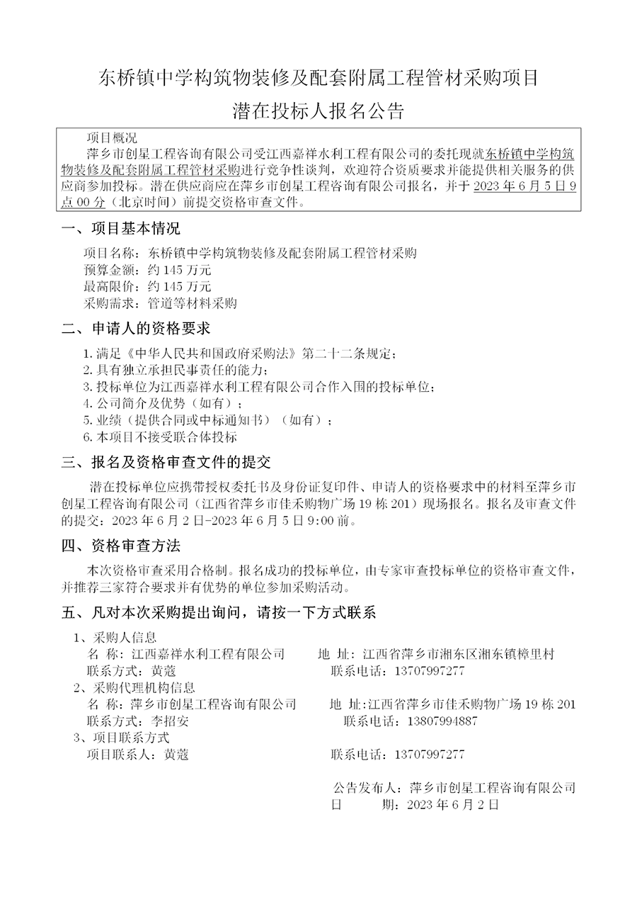 東橋鎮(zhèn)中學(xué)構(gòu)筑物裝修及配套附屬工程管材采購項(xiàng)目 潛在投標(biāo)人報(bào)名公告
