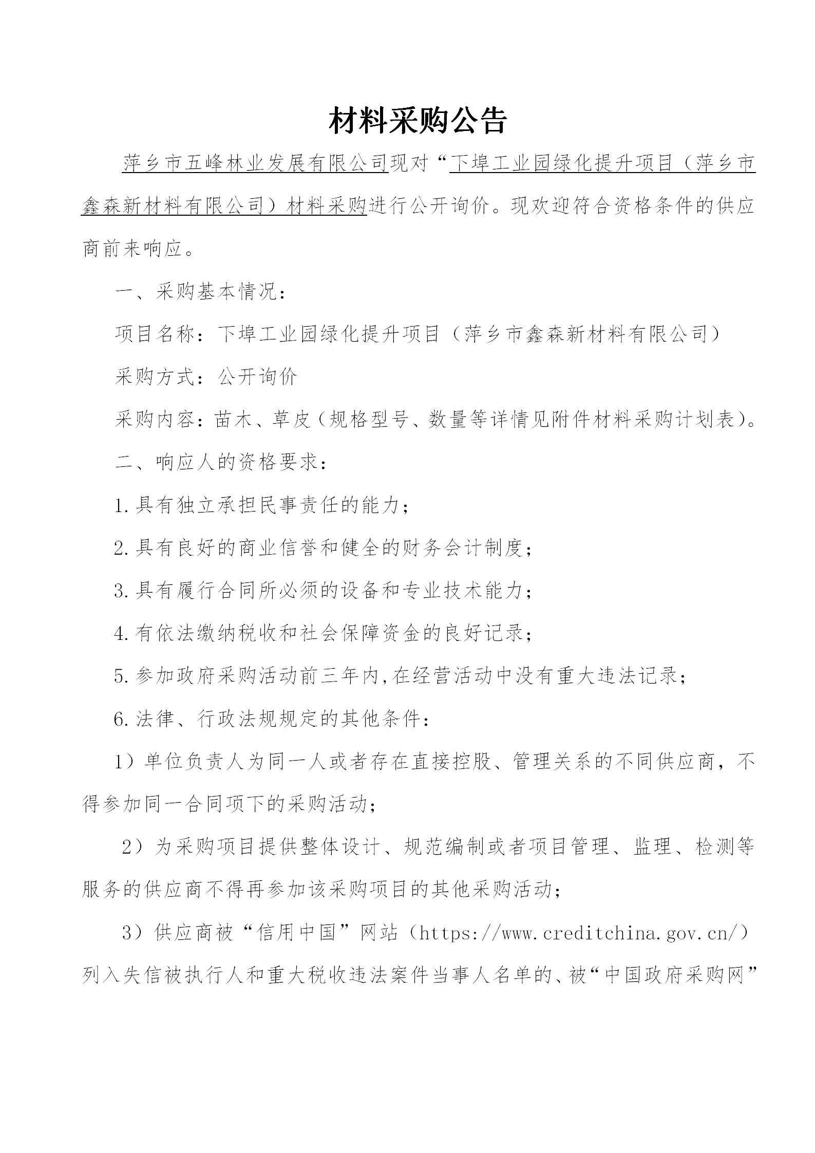 萍鄉(xiāng)市五峰林業(yè)發(fā)展有限公司現(xiàn)對(duì)“萍鄉(xiāng)市湘東區(qū)萍電片區(qū)排水防澇能力提升項(xiàng)目材料采購進(jìn)行公開詢價(jià)?,F(xiàn)歡迎符合資格條件的供應(yīng)商前來響應(yīng)。